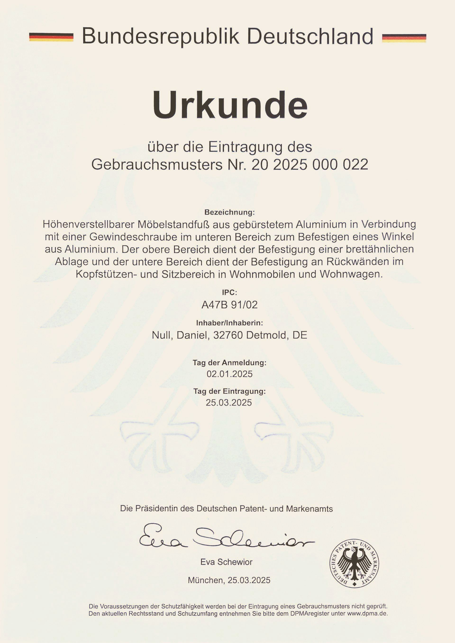 Urkunde - "Befestigung Ablageboard / Standfuß mit Winkelansatz"