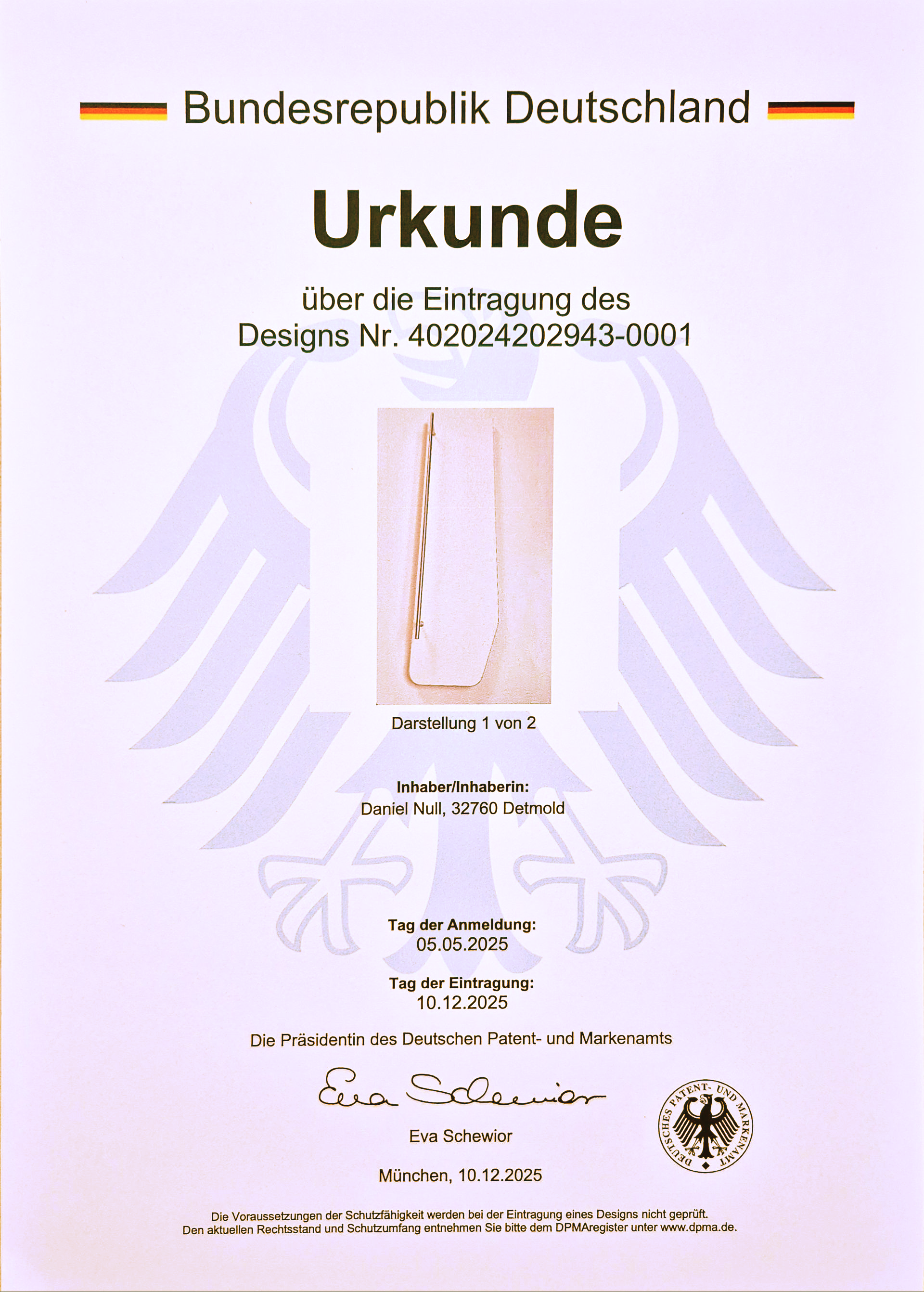 Urkunde - "Ablageboard / Design-Form" Eingetragenes Design