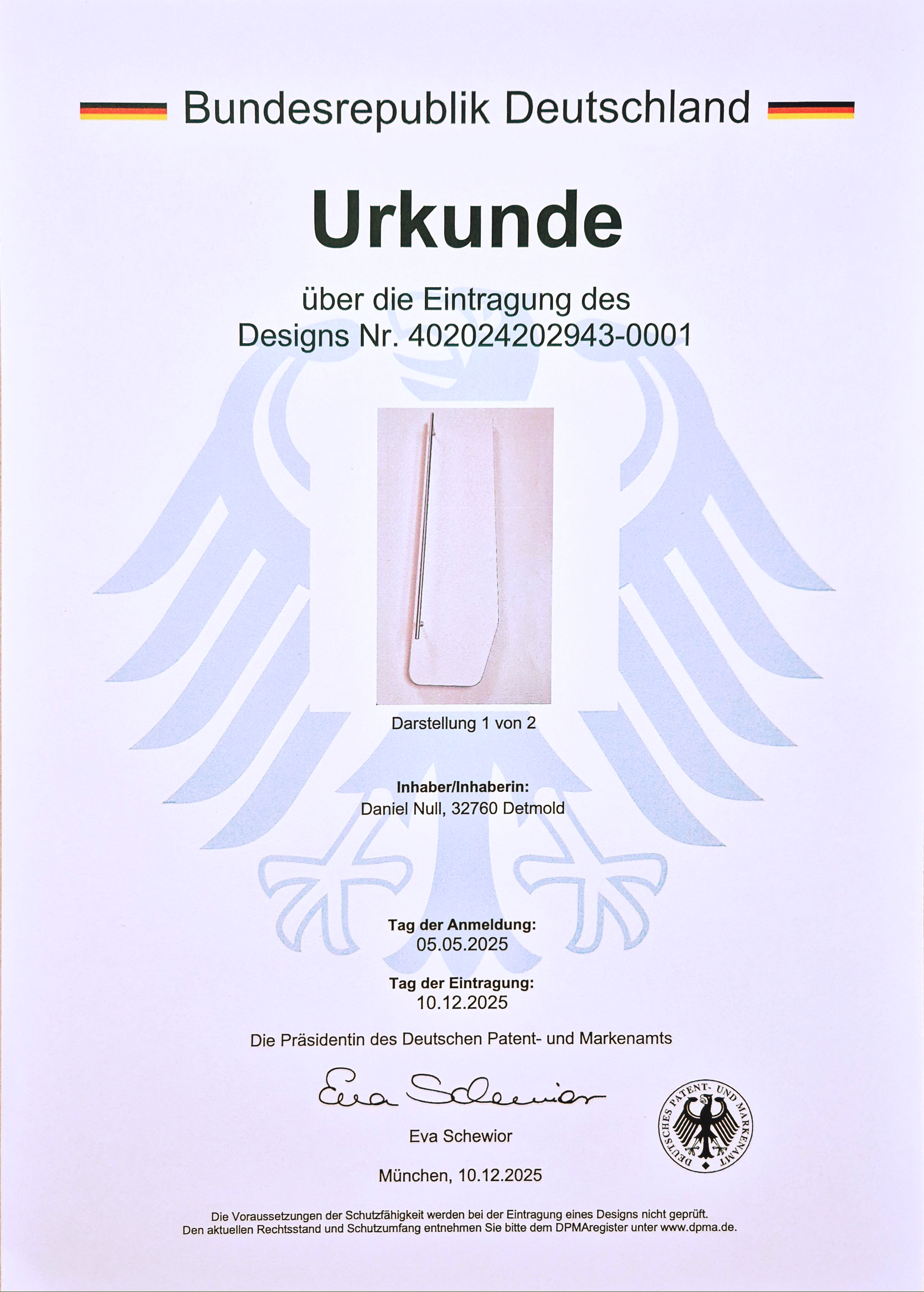 Urkunde - "Ablageboard / Espresso-Board" Eingetragenes Design